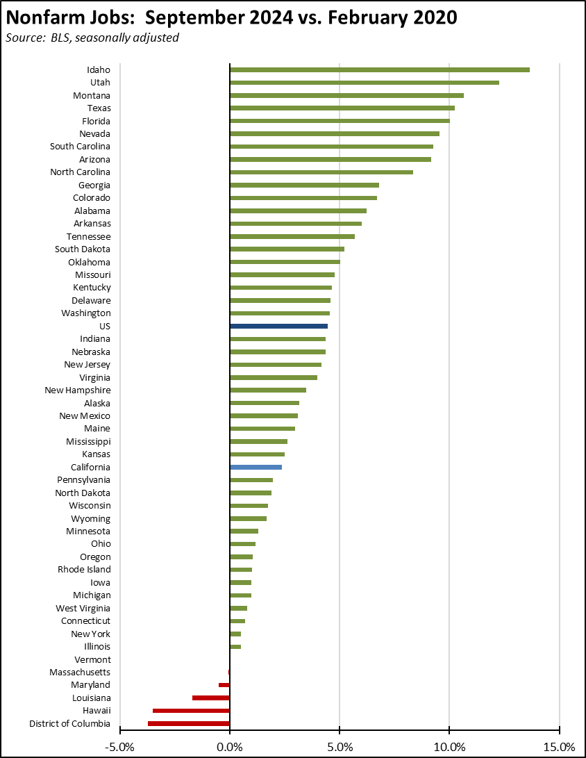 - Long-term Trends: Since February 2020, California has gained 420,700 jobs, the third highest among states, but ranks 31st when adjusted for population size.
