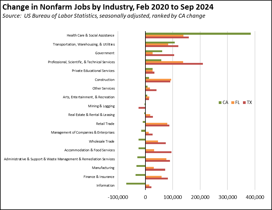 This dominance by government and government supported (Health Care & Social Assistance) jobs has been the case since the pandemic. California has experienced job growth primarily as the result of buying it using state, local, and federal tax dollars. The two job leaders—Texas and Florida—in contrast have experienced jobs growth as their private sectors have expanded.