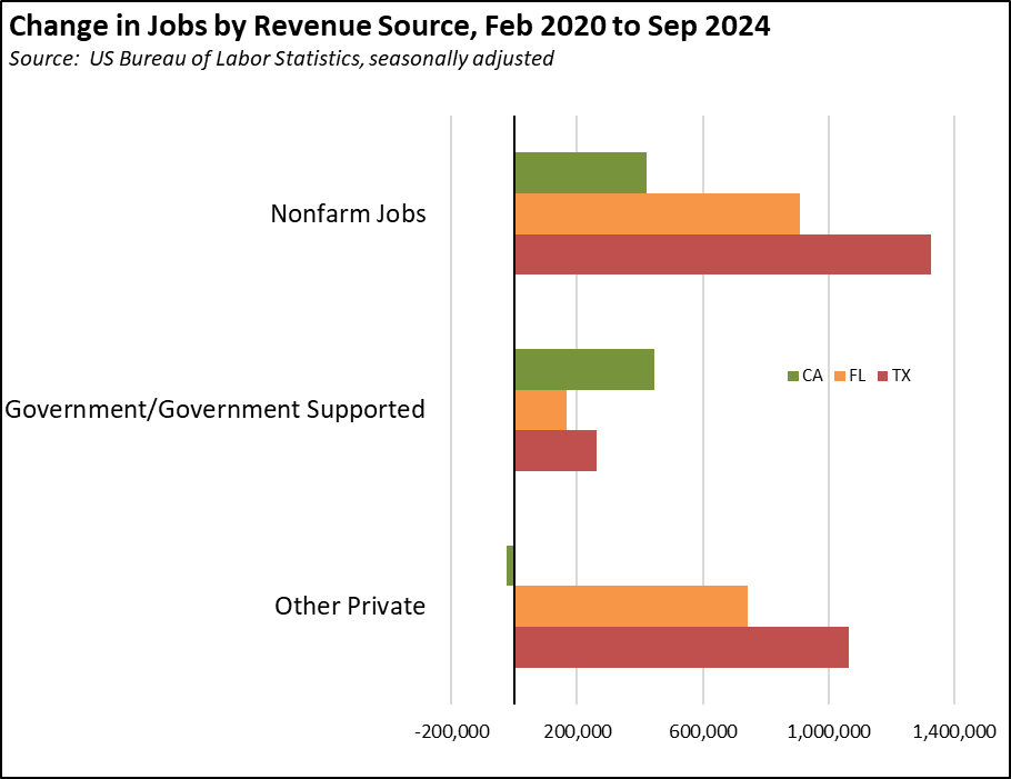 Within California, elements of the private sector have grown, notably Transportation, Warehousing & Utilities, but this growth is now at risk of being choked off due to expanding state and local regulations. These gains also have been outweighed by net losses in other industries. Instead, growth in such key California strengths as Manufacturing, Construction, Accommodation & Food Services, Information, Finance & Insurance, and Professional, Scientific, & Technical Services has shifted to other states. Texas and Florida have grown the private sector needed to support their additional government and government-supported jobs. California instead now has a jobs model dependent on continued access to public dollars. Putting Health Care & Social Assistance to one side, the number of other private sector jobs in California is now lower than before the pandemic.