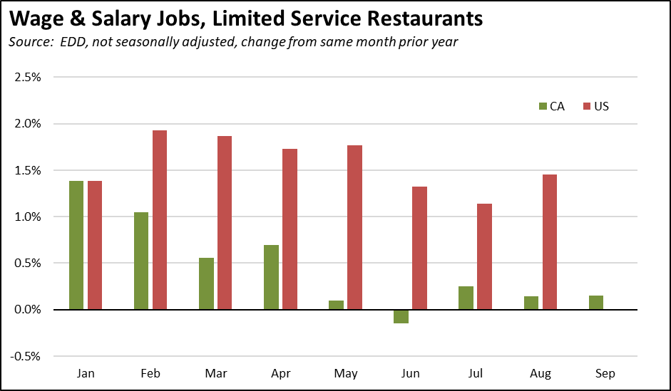 A case in point is the continuing disputes over the effect of the recent fast food minimum wage hike. In the latest data using the not seasonally adjusted data and comparing the same months in 2023 and 2024, the number of jobs in Limited Service Restaurants grew by only 1,100 in both August and September. In contrast, the US numbers show a gain of 69,000 in August (September not yet available), indicating the extent to which the increased California labor costs have affected growth in this industry.