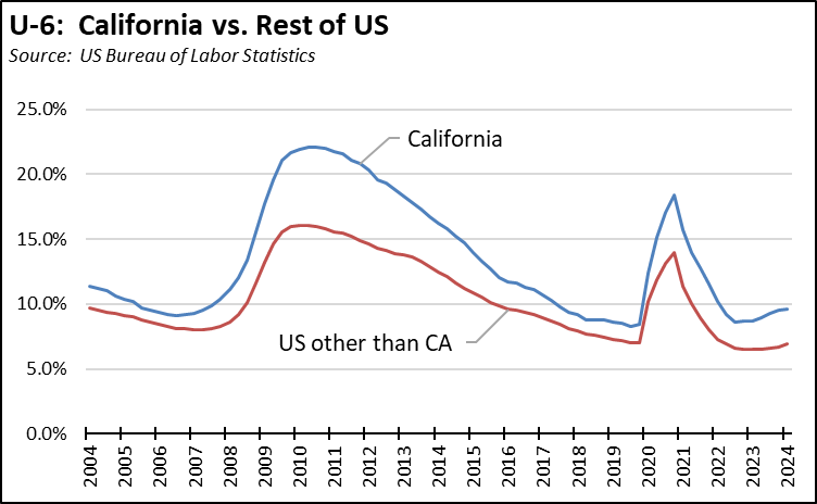 - High Unemployment Rates: California’s unemployment rate remained tied for 2nd highest among the states at 5.3%, with a broader U-6 rate of 9.6%, the highest in the nation.