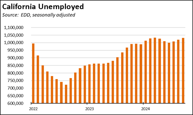 California’s unemployment rate in September was unchanged at 5.3%, but again tied with Illinois for the 2nd highest among the states. Nevada led with 5.6%, while DC came in higher than the states at 5.7%. California unemployment has been above the 1 million mark every month so far in 2024, nearing levels previously seen in December 2021. Overall, the number of unemployed in September was 22.6% higher than in December 2018. In that same period of time, employment dipped 1.9% even though the potential labor pool represented by Civilian Population (civilian populations age 16 and over) grew by 6.5%.