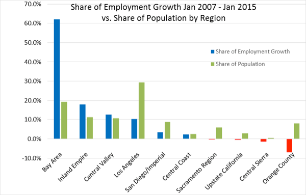 Net employment growth for the state as a whole is now positive, with a total increase of 689,700 between January 2007 and January 2015. However, this net growth has been heavily concentrated within specific regions, with the Bay Area alone accounting for 62% of the total employment growth while containing only 19% of the total population. Los Angeles, with 29% of the population, represents only 10% of total employment growth.