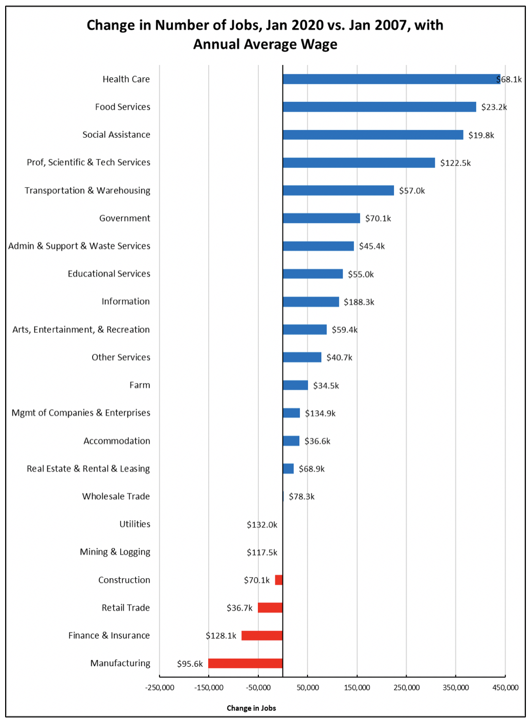 Comparing current job numbers to the pre-recession levels in 2007 illustrates the structural shift in the state’s economy, with the primary jobs growth occurring in the higher and lower wage industries. The revised jobs numbers show a deeper loss position for Manufacturing, Finance & Insurance, and Retail Trade, while Health Care and the lower wage Food Services and Social Assistance continue to lead.