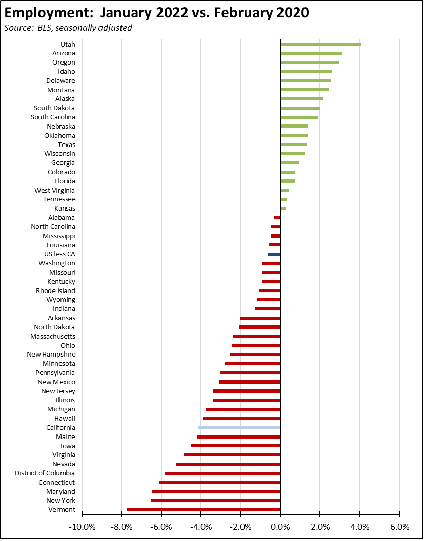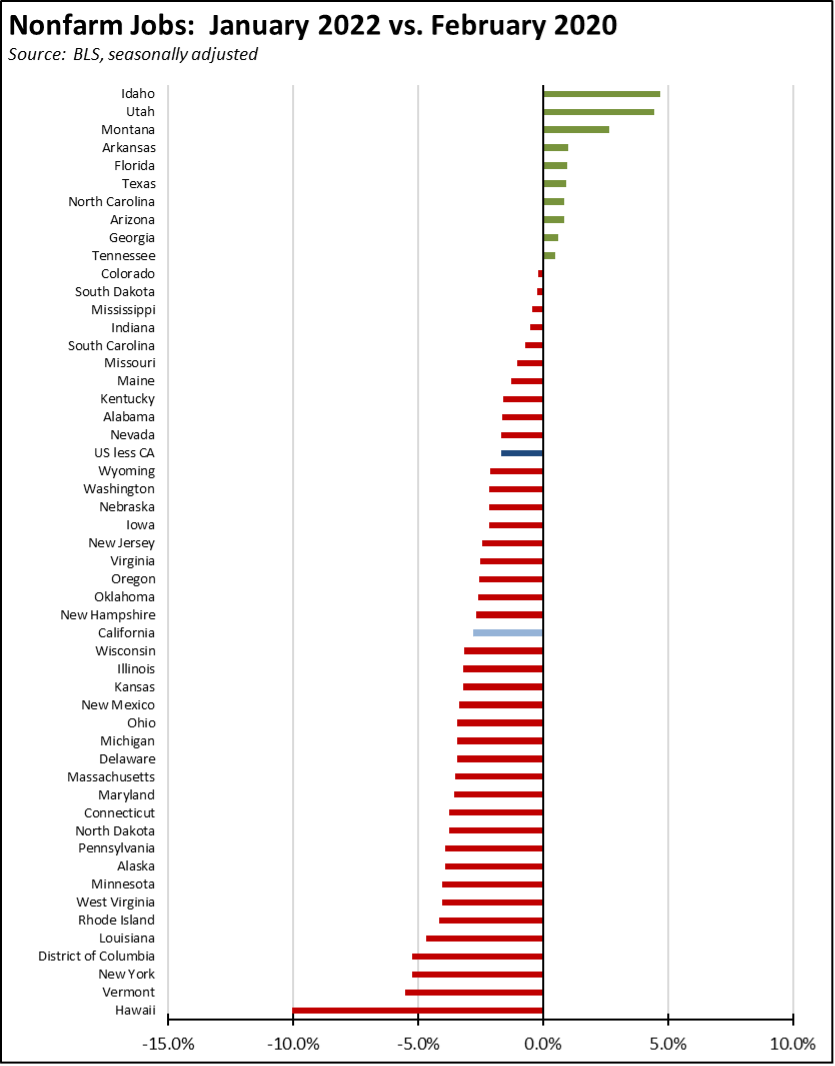 Ranked by employment compared to the pre-pandemic level, 19 states—or approaching half—are now above recovery, with California showing only minor movement to the 42nd highest recovery rate.