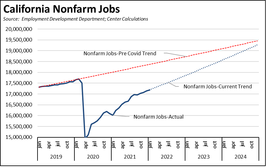 Even with these improvements, California continues to lag the rest of the nation in recovery. As measured against the pre-pandemic peak in February 2020, nonfarm jobs are still 2.8% short of recovery in California compared to 1.7% in the rest of the states. Employment is still 4.1% below compared to only 0.7% in the rest of the states.