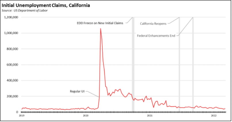 Based on the March average numbers, California contained 20% of all initial claims nationally. As of February 26, California contained 22% of the insured unemployed (a proxy for the number of continuing claims).