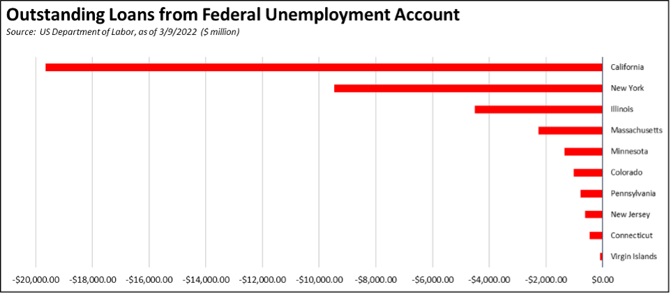 California unemployment insurance fund debt showed little movement, coming in at $19.7 billion as of March 9, or 49% of the total owed by all the states and territories.