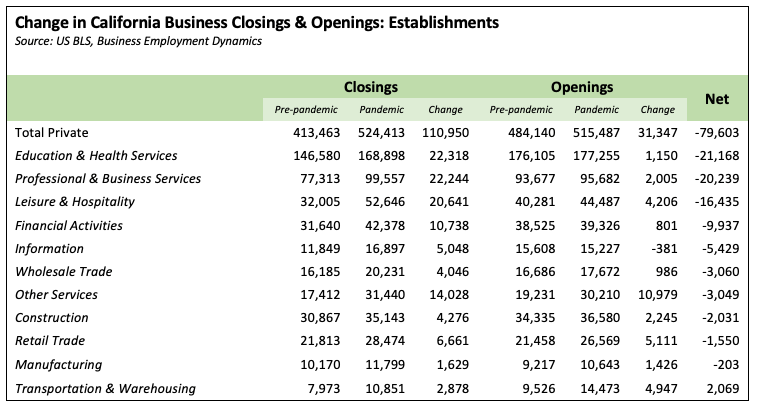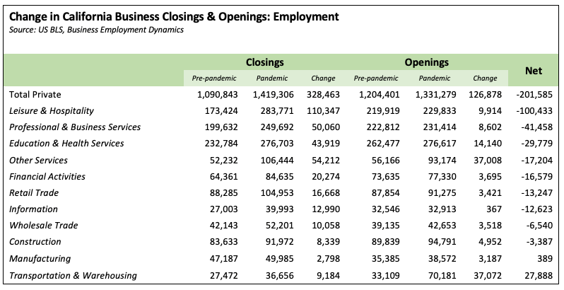 This data also illustrates that establishments did not just close in this period, but there was also substantial activity as new ones were opened. Several industries saw an increase in openings either because of shifting consumer demand (e.g., Health Services and internet-based retail sales) or as in the case of Professional & Business Services, the tech component expanded during the pandemic due to their rapid shift to alternative operating modes.