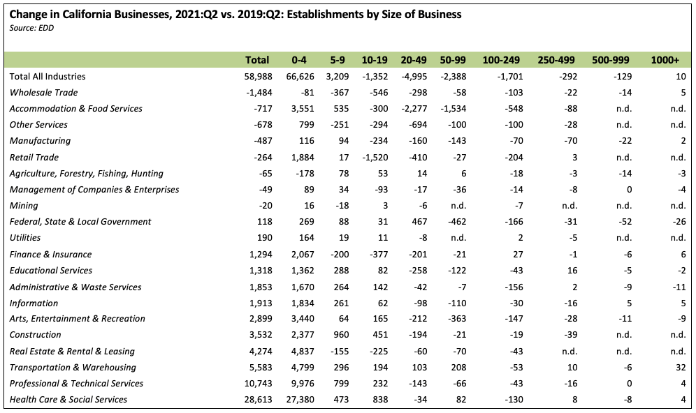There has been considerable movement within each of these industries, with most of the losses taken by medium-sized businesses and growth within smaller ones including sole person establishments. Comparing the most recently available second-quarter results by size of business in 2021 with the same quarter in pre-pandemic 2019, the number of establishments grew by 58,988, but only as a loss (both from closures and establishments reducing their jobs) of 10,857 establishments in the 10-999 employee range was offset by an increase of 69,835 in the 0-9 employee range plus an additional 10 moving into the 1000+ range. Note that in some cases, the data in the table was not reported (n.d.) due to non-disclosure requirements.