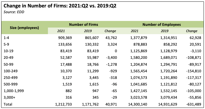 EDD, however, provides quarterly data on the number of firms in California by the size of business. Comparing the most recent second-quarter data with the same period in pre-pandemic 2019, California has seen an increase of 43,762 firms operating in the state. As with the establishment data, however, there has been a loss of 6,115 firms of 10 or more employees (either through closure or shrinkage of firms) offset by an increase of 47,086 firms of smaller size. By employment, the larger firms combined show a jobs loss of 715,008, offset by a gain of only 83,519 in those of 9 employees or fewer.