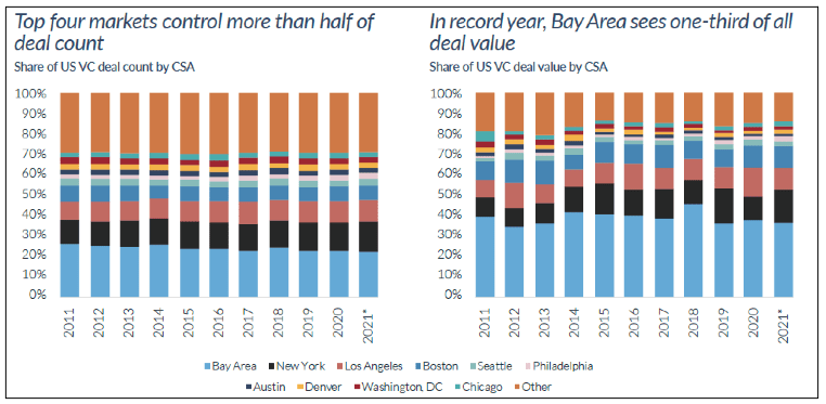 The Bay Area continues to be the largest source of these deals, with Los Angeles still coming in at a somewhat more distant third. Although its dominance has declined somewhat as venture capital has spread to other emerging centers, the Bay Area accounted for about a third of all US deals by value for the past three years.