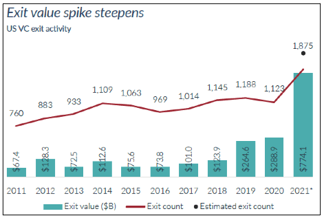 Pitchbook also reports that venture capital exits were up even higher in 2021. Nearly 90% of the exit value was through public listings, including both IPOs and SPACs, and the remainder from acquisitions.