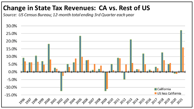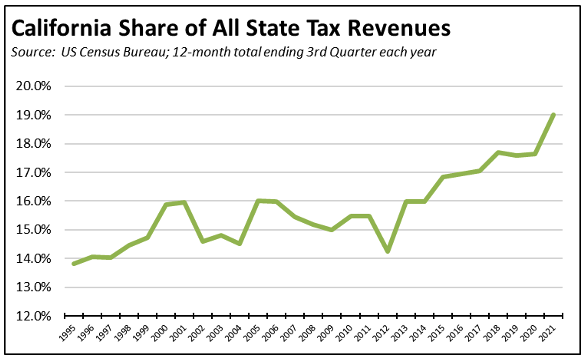 The expansion of tax revenues is also shown in California’s increasing share of the total taxes levied by all states. While California is about 12% of the nation as measured by population or its economy, its high tax status has always put this share somewhat above. The amount of this above, however, has been growing sharply. Again, using the annualized data as above, California in 1995 produced 13.8% of the total state tax revenues in the nation. In the most recent data, California’s share is just short of one-fifth of all state taxes, at 19.0%.