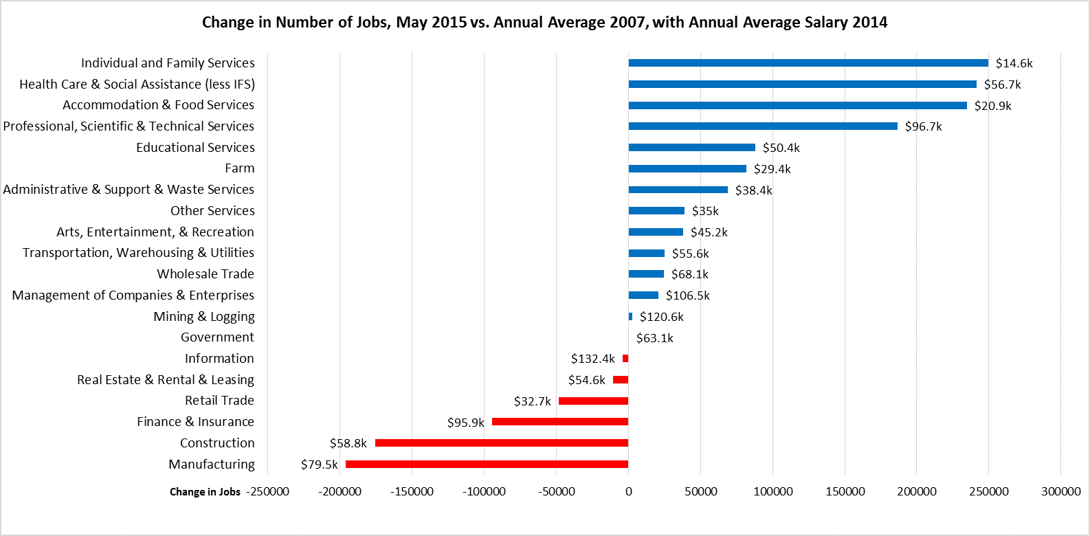 As indicated in the figure above, growth continues to be primarily in the lower wage and higher wage industries, with two of the top three growth industries paying well under $2,000 a month in average wages. The largest gaps remain in the middle class-wage industries of Manufacturing and Construction.