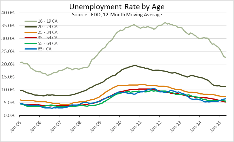 - Compared to the US averages, California youth (ages 16-19) show substantially higher unemployment rates, a situation likely affected by the state’s lag in creating employment opportunities at the same pace as employment growth as well as California’s substantially higher minimum wage.