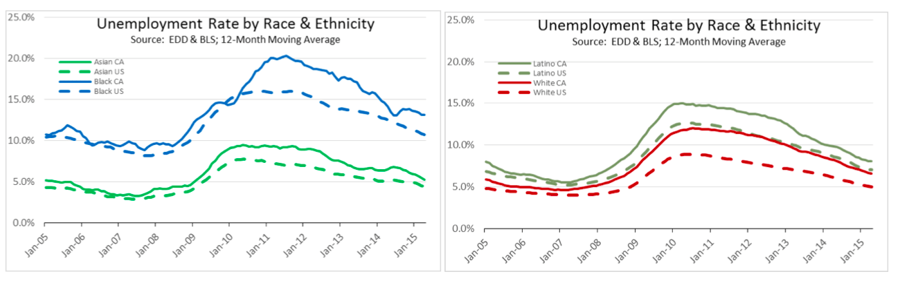 - Asian Californian unemployment rates are nearing levels historically considered as full employment; Asians are also the only group to show unemployment rates below the current US 12-month moving average. Latinos remain elevated above both the pre-recession level and the state average. Black Californians remain at double-digit rates—double the rate of Whites and more than double the rate of Asians.