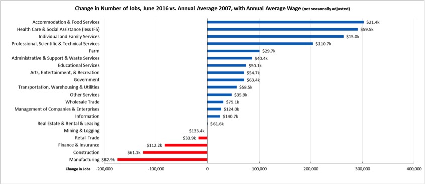 Comparing the number of jobs by industry in June 2016 (not seasonally adjusted), five industries showed employment below the 2007 pre-recession levels. In the highest gain industries, Accommodation & Food Services—the second lowest wage industry—became the leading industry as a result of seasonal tourism. The highest wage blue collar industry—Mining & Logging—remained slightly in negative territory as oil prices remained low.