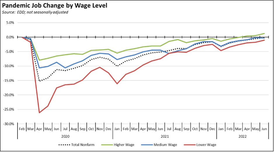 While California remains 175,900 jobs short of recovery to the pre-pandemic level, the job openings data discussed later below indicates that there were over seven times as many unfilled job openings than what was needed to close this remaining gap. The challenge is not that employers are not creating jobs. The challenge is that they need workers to fill them and fill them on a broad range of wage levels.