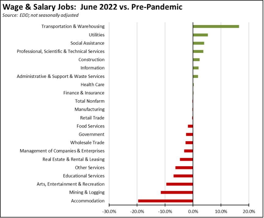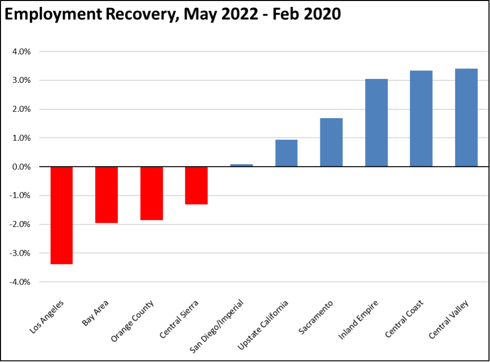 With San Diego/Imperial moving back to negative, Los Angeles Region continues to lag the rest of the state in recovery to the pre-pandemic peak employment levels.