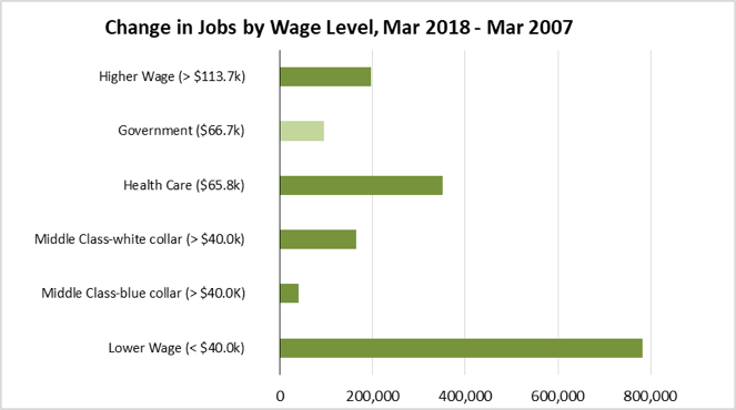 The following chart illustrates the trend for total wage and salary jobs by general wage level, according to the industry wage classification used previously in other Center analyses of this issue. As indicated, over half (59%) of net jobs growth since the recession has been in the lower wage industries. For the 12 months ending March 2018, lower wage industries accounted for about a quarter (24%) of new jobs, while middle class-blue collar jobs produced about another third (30%) as a result of improvements in Construction levels.