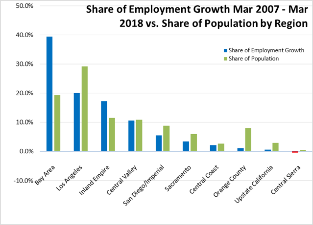 Containing 19.4% of the state’s population, the Bay Area was responsible for 39.5% of the net growth in employment since the pre-recession peaks in 2007. Los Angeles Region, containing 29.2% of the population, accounted for the second largest share at 20.1%. Inland Empire is the only other region continuing to show employment gains above their population share.