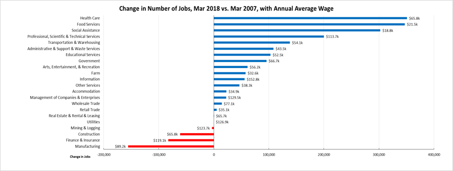 Comparing the number of jobs by industry in March 2018 (not seasonally adjusted), four industries had employment below the 2007 pre-recession levels. The highest gain industries were led by Health Care (with a relatively higher mix of lower and higher wage occupations), lower wage Food Services and Social Assistance, and higher wage Professional, Scientific & Technical Services. Of the lagging industries, three—Manufacturing, Mining & Logging, and Construction—are blue collar middle class wage industries, while the higher wage Finance & Insurance also remained in the minus column. Construction has overall improved but still remains 61,200 below the 2007 level, and 133,500 below the previous high in 2006.