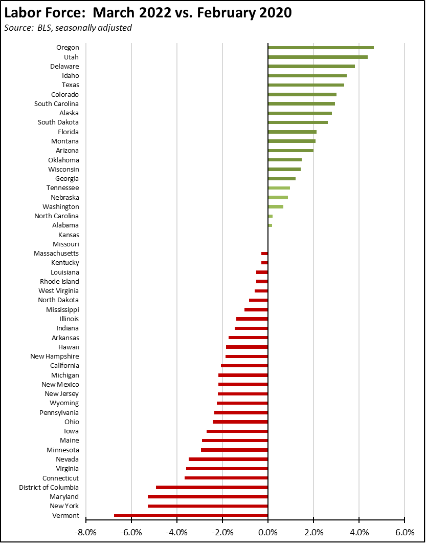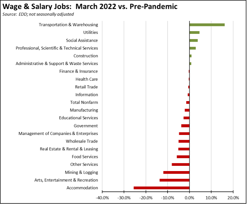 In all, 24 states now show employment levels above the February 2020, pre-pandemic level. Even with the stronger March numbers, California’s rank changed only marginally, going from 42nd to 41st on this measure.