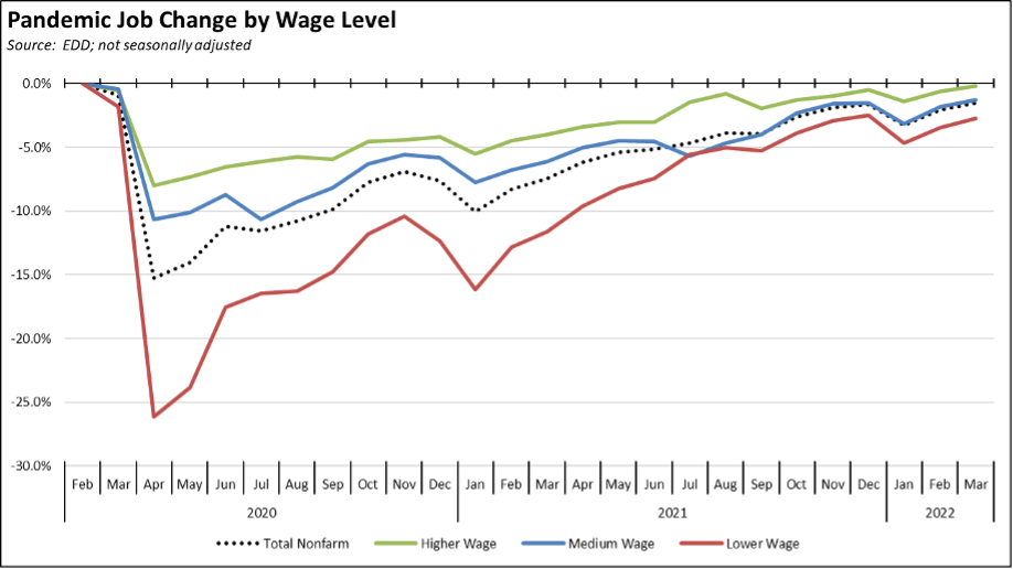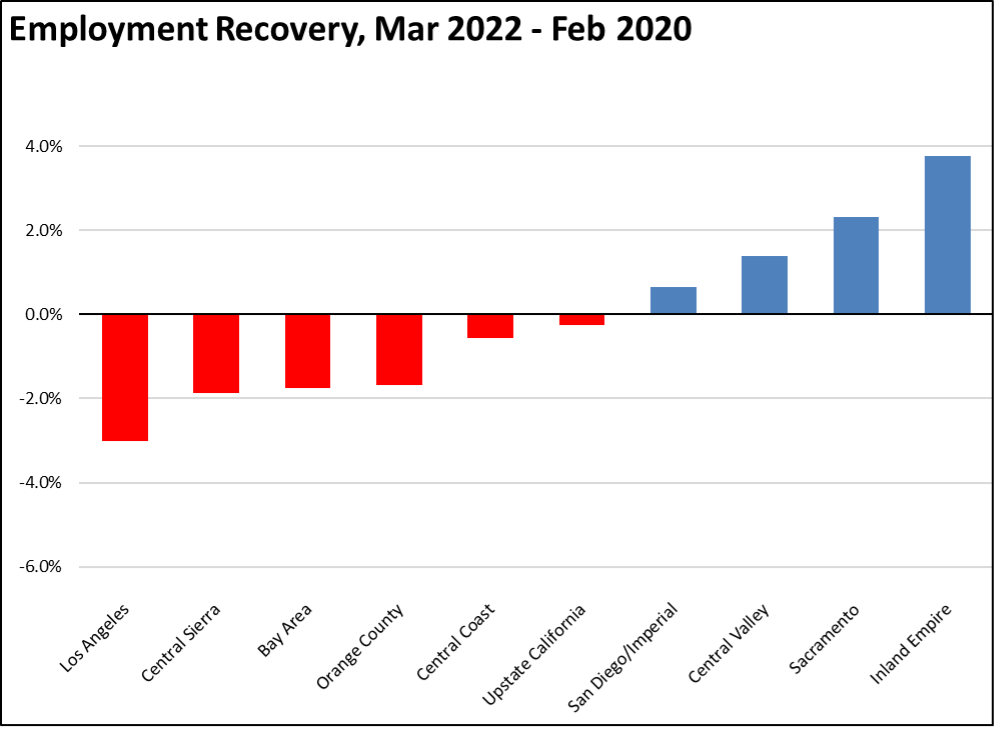 In part reflecting migration patterns during the pandemic, the interior regions of the state plus San Diego show employment above pre-pandemic levels. Los Angeles, which saw some of the deepest job losses due to its increasing incidence of lower-wage service jobs, remains the furthest behind.