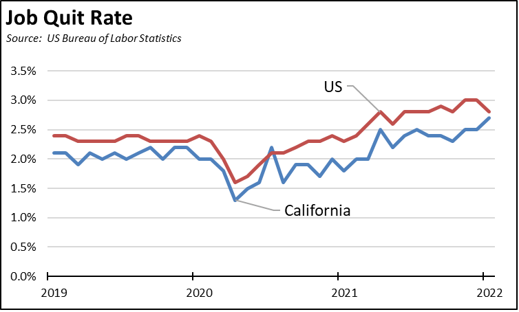 The lag in the employment numbers also reflects increasing churn within the job numbers as more workers quit their jobs in order to move to others paying higher wages and/or benefits. While this activity reflects a long-term wage strategy typically pursued by workers, the current and ongoing labor shortages have elevated the opportunities to do so. Measured by the job quit rate from the Job Openings and Labor Turnover Survey data, California has been behind the rest of the country in this trend.