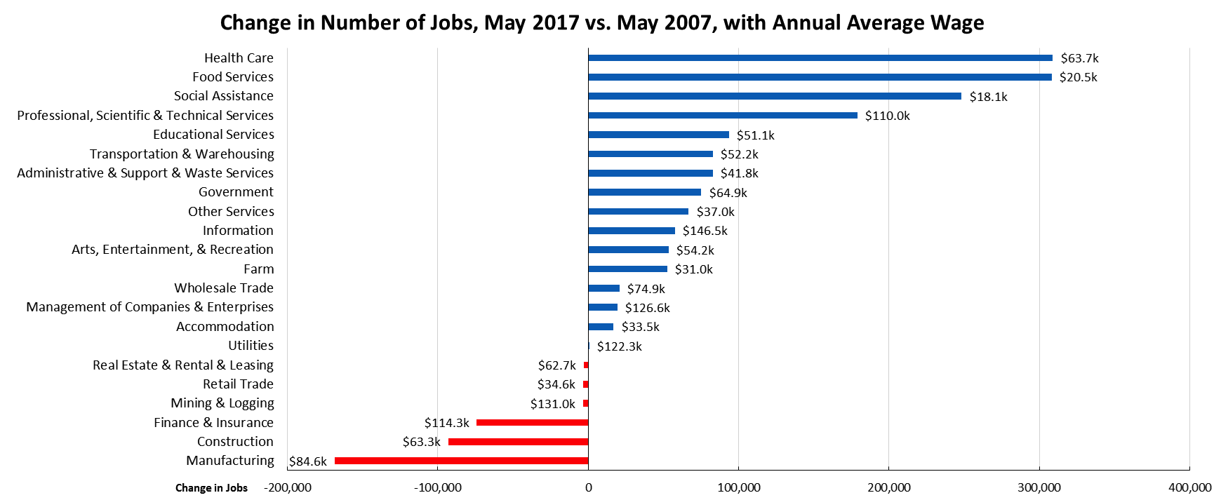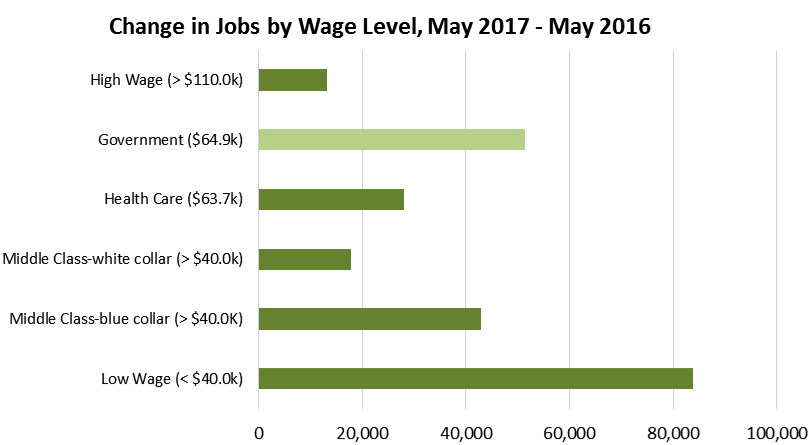 Comparing the number of jobs by industry in May 2017 (not seasonally adjusted), 6 industries had employment below the 2007 pre-recession levels. In the highest gain industries, Health Care and lower wage Food Services were essentially tied as the leading job gains, while lower wage Social Assistance and higher wage Professional, Scientific & Technical Services remained in 3rd and 4th place, respectively. Of the lagging industries, three—Manufacturing, Mining & Logging, and Construction—are blue collar middle class wage industries, while the higher wage Finance & Insurance also continued to lose ground.
