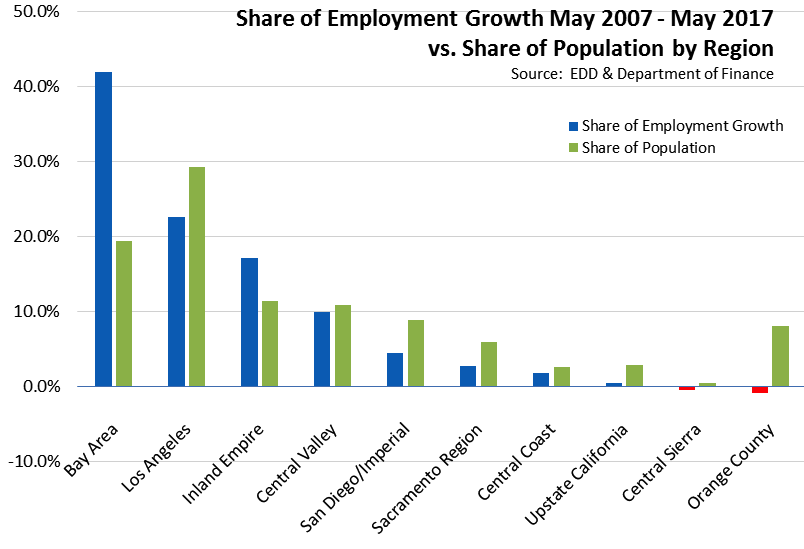 Containing just under 20% of the state’s population, the Bay Area was responsible for 41.9% of the net growth in employment since the pre-recession peaks in 2007. Los Angeles Region provided the next largest share at 22.6%, but spread over 29.3% of the population. Inland Empire is the only other region showing employment gains above their population share.