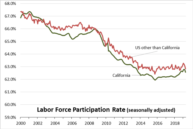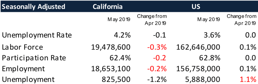 For the 12 months ending May 2019, the seasonally adjusted data shows the California labor force grew 0.7% compared to the rest of the US at 0.6%.