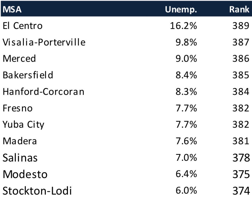 Of the 20 Metropolitan Statistical Areas (MSAs) with the worst unemployment rates in April 2018, 11 are in California, including El Centro MSA (Imperial County) with the highest unemployment rate in the country and Visalia-Porterville MSA with the third worst.