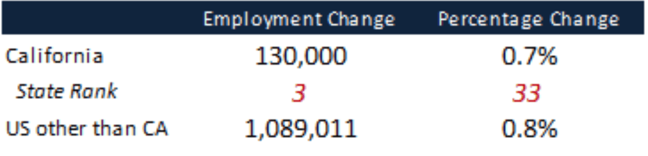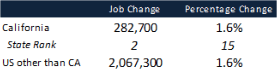 On a percentage basis, California at 15th among the states, with a 12-month jobs growth rate of 1.6%, the same as the average for all the other states.