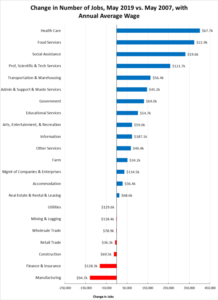 Comparing current job numbers to the pre-recession levels in 2007 illustrates the structural shift in the state’s economy, with the primary jobs growth occurring in the higher and lower wage industries.