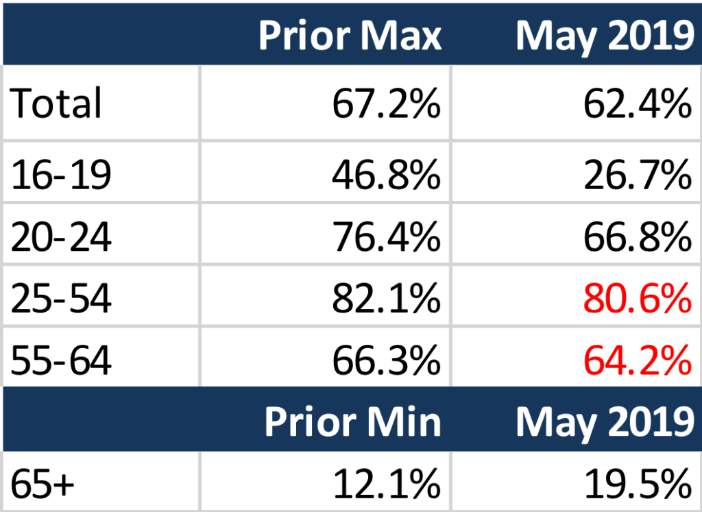 Labor force participation by age (12-month running average) eased for adults while remaining level for youth and seniors but improving for young adults. The continued low rates for youth and young adults in particular have implications for life-time earnings potential due to the delay in acquiring essential workplace skills. While more people are working past age 65, these gains do not offset the sharp drops in the youngest groups and softness in the prime working age groups.