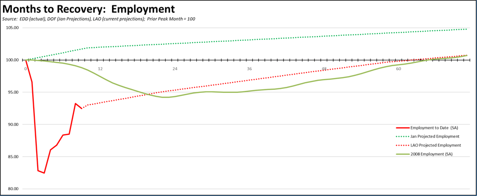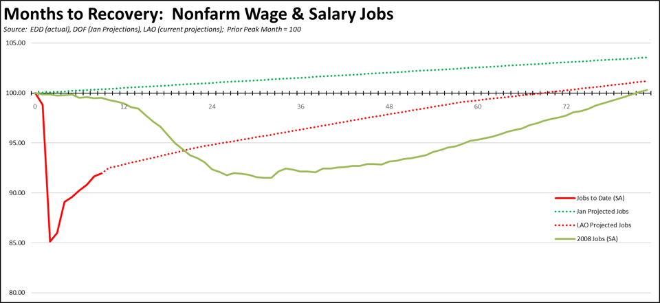 Combining the actual employment numbers to date with the most recent economic projections from the LAO, employment recovery is currently on track to match the shallow recovery just experienced following the prior recession in 2008. At the LAO projected recovery rate, the prior employment peak in February 2020 will not be reached until sometime in 2025. (These numbers will be revised with updated Department of Finance projections to be released with the budget in January.)