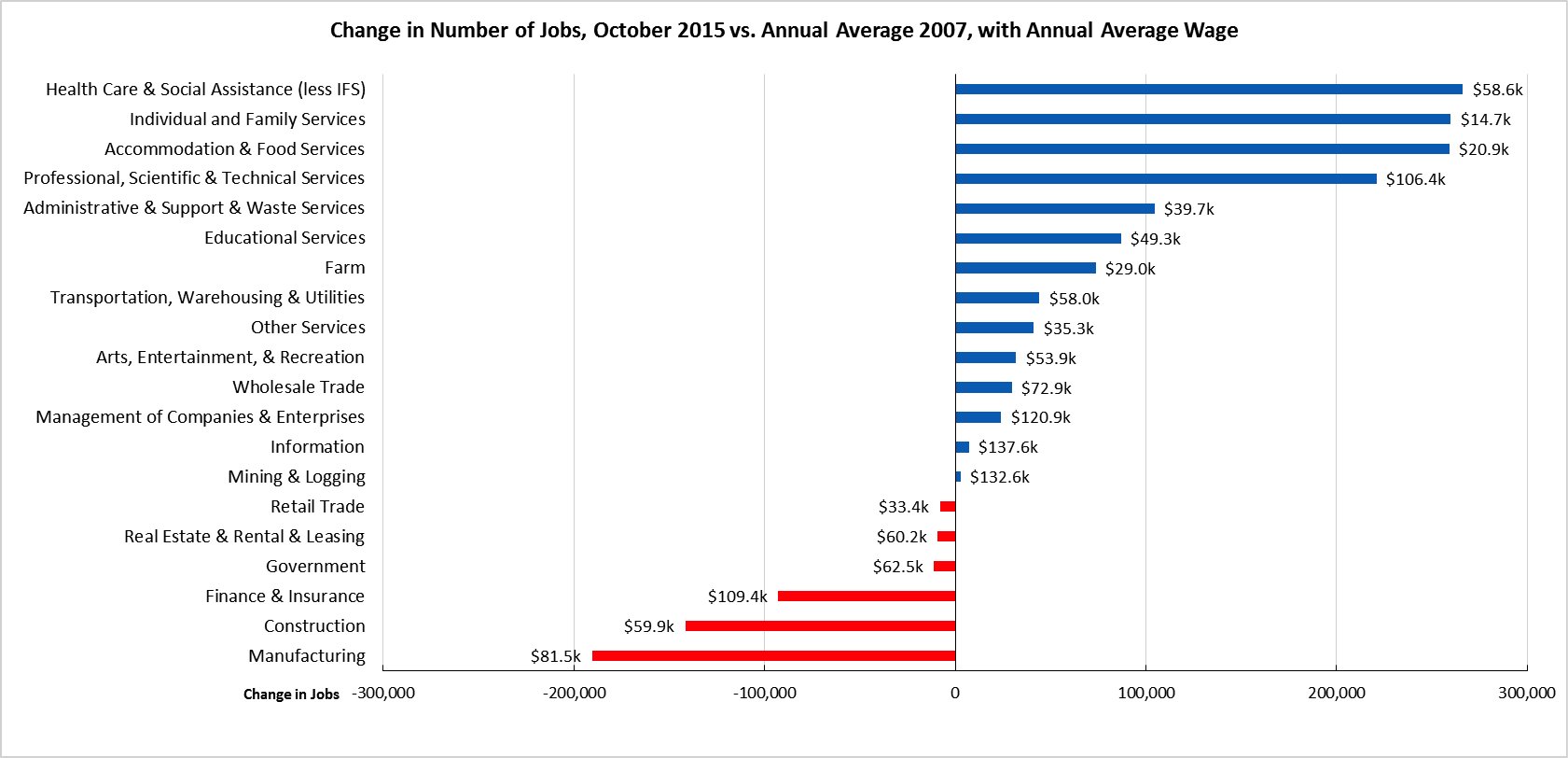 Comparing the number of jobs by industry in October 2015 (not seasonally adjusted), 6 industries remain below the 2007 pre-recession levels. Net job growth continues to be dominated by two higher wage and the two lowest wage industries.