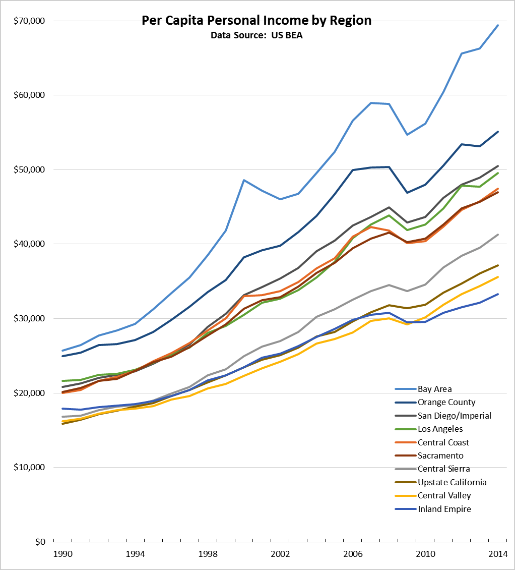 Per capita personal income growth by region in shown in the following graph. All ten regions experienced per capita personal income growth in 2014, ranging from 2.9% in Sacramento Region to 4.7% in the Bay Area. Per capita personal income ranged from $33,258 in the Inland Empire, to $69,402 in the Bay Area. The Bay Area accounted for one-third (33.3%) of the net growth in total California personal income, followed by Los Angeles Region at 26.6%.