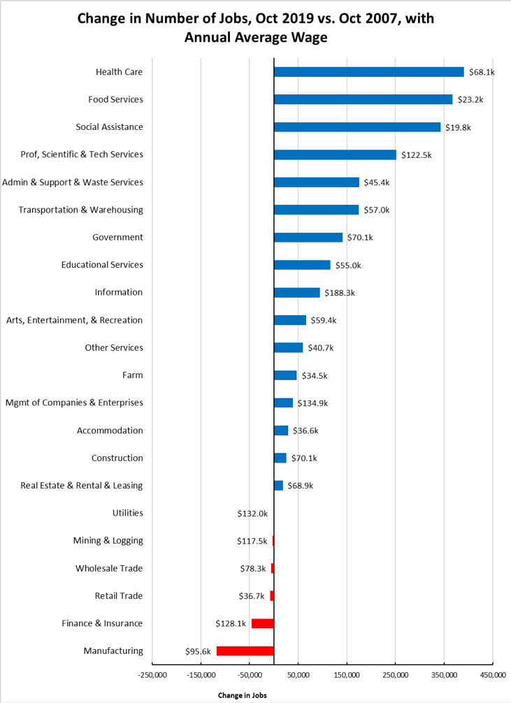 Comparing current job numbers to the pre-recession levels in 2007 illustrates the structural shift in the state’s economy, with the primary jobs growth occurring in the higher and lower wage industries.