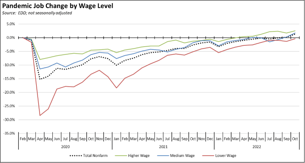 The jobs recovery in California also varies across industries and wage level. Using the unadjusted numbers to show results by average wage level, recovery and now growth continues to be the strongest in the higher wage industries. The medium wage industries continue to track overall nonfarm trends. The lower wage industries, in contrast, still have yet to reach this recovery benchmark.