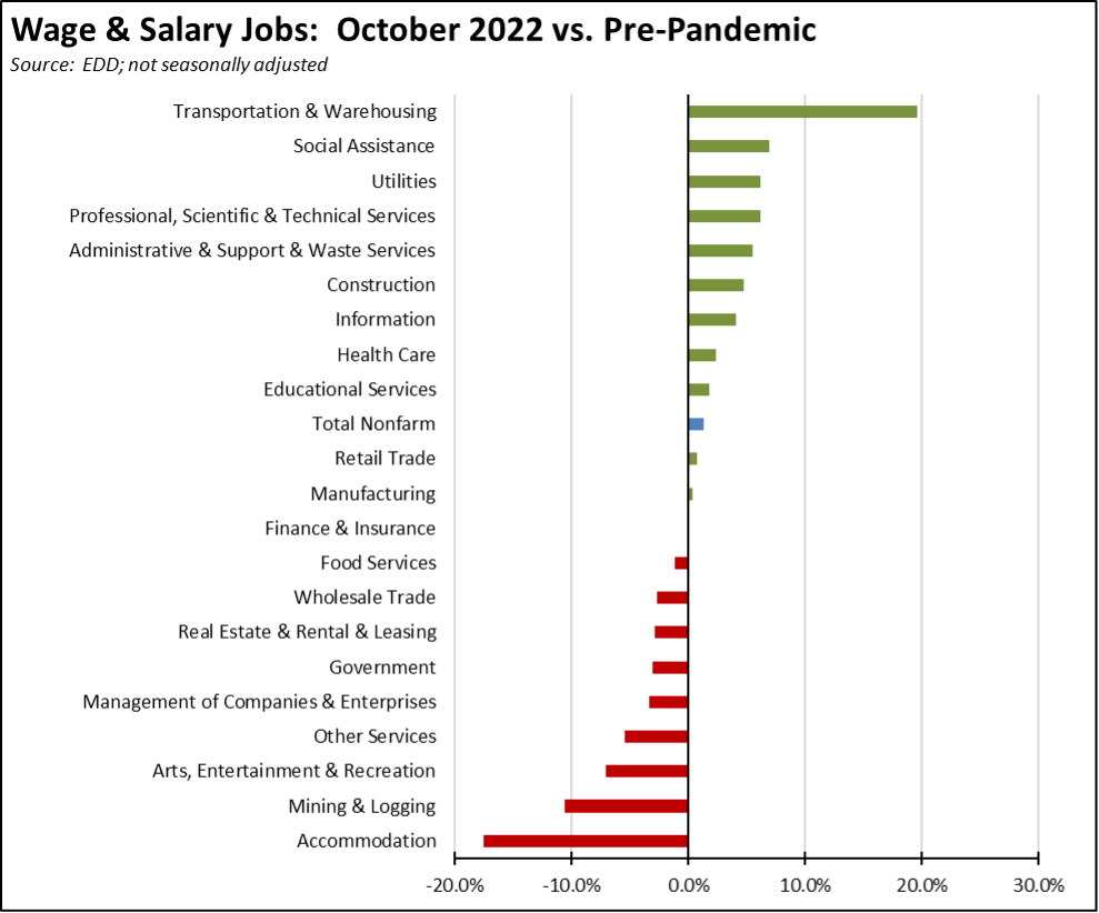Future jobs growth faces two primary prevailing forces. The risk of recession in 2023 appears to be increasing, although most forecasts expect one to be relatively mild under current Fed policies. Continued disruptions in energy markets, with California energy prices still soaring to new heights and the federal administration apparently still hoping for an energy bailout from foreign sources rather than domestic production, could affect the severity as well.