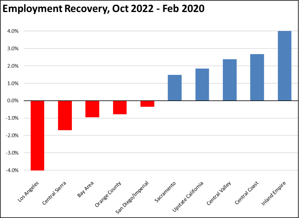 Los Angeles Region continues to lag the rest of the state in recovery to the pre-pandemic peak employment levels. Central Sierra shifted into the negative column primarily due to seasonal factors.