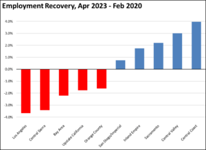 Los Angeles Region continues to lag the rest of the state in recovery to the pre-pandemic peak employment levels (not seasonally adjusted).
