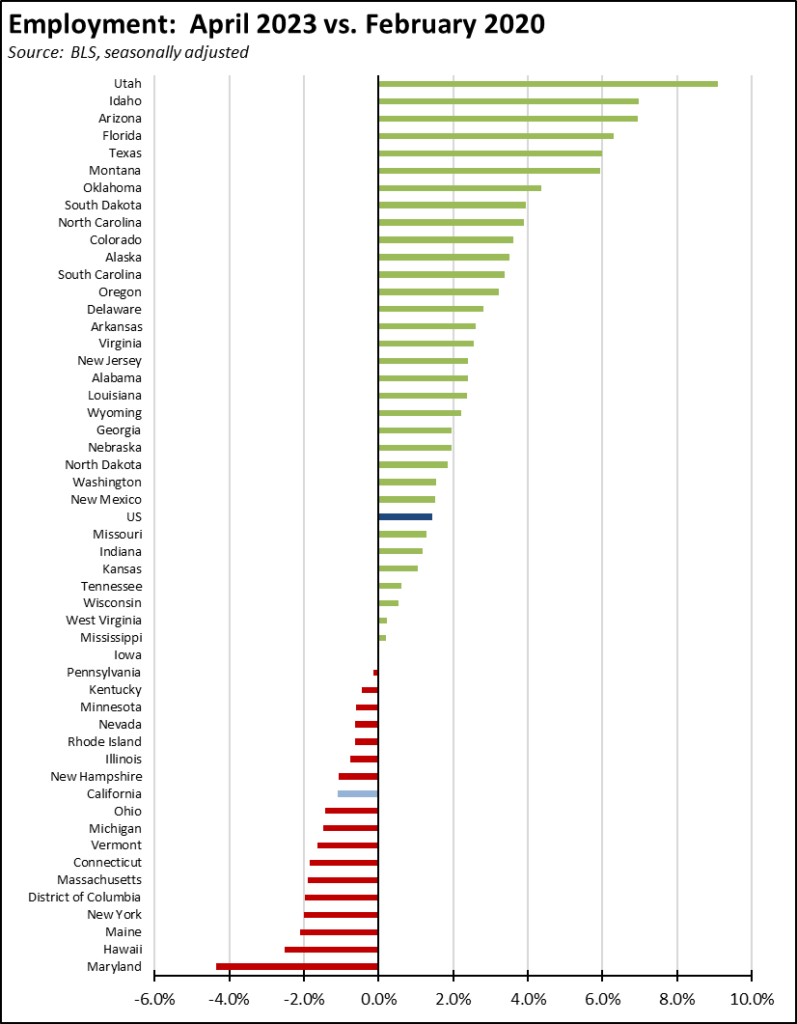 Compared to the pre-pandemic peak in February 2020, California’s weak employment recovery again placed it 41st highest among the states and DC.