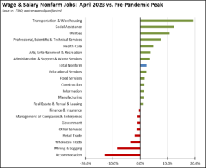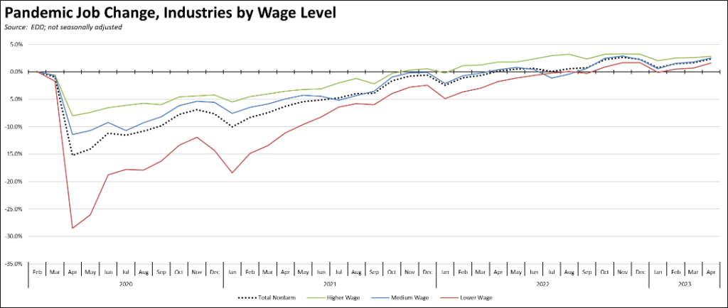 Using the unadjusted series to provide a more detailed look at jobs by industry wage level, recovery across the three wage levels began to converge as gains in the higher wage industries began to level out. Lower wage industries still show the weakest recovery, but showed the strongest gains as seasonal hiring picked up.