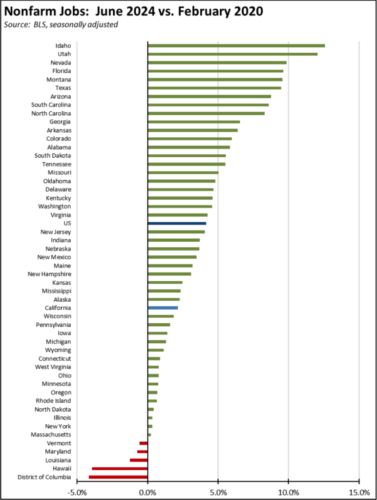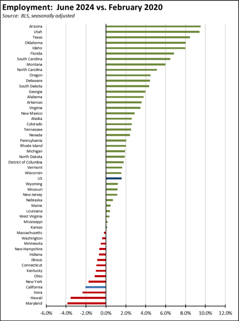 Compared to the pre-pandemic peak in February 2020, California’s sustained weakness in employment recovery changed only incrementally from 3rd to 4th lowest among the states and DC.