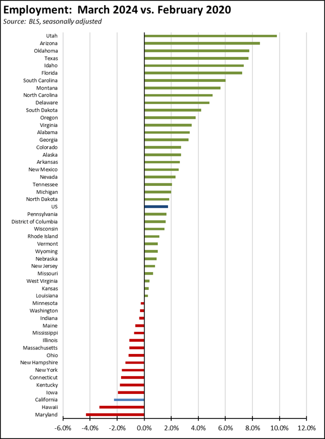 Compared to the pre-pandemic peak, California has now gained a new 319,200 nonfarm jobs, still in 4th place among the states and DC.