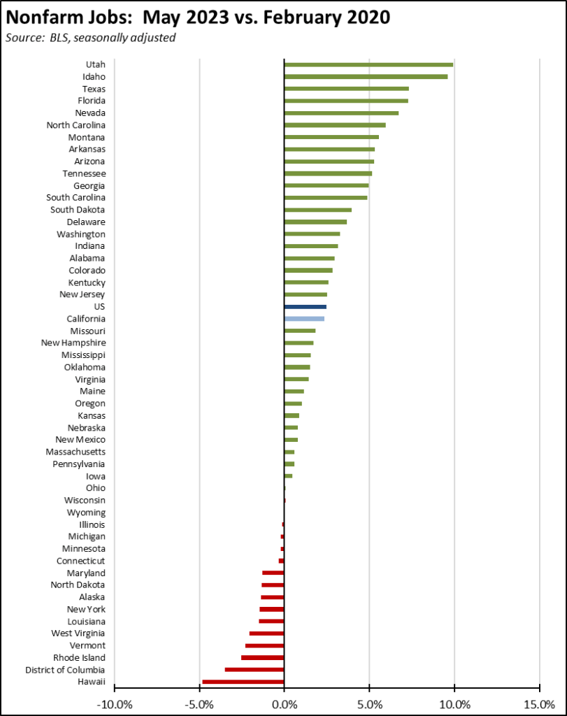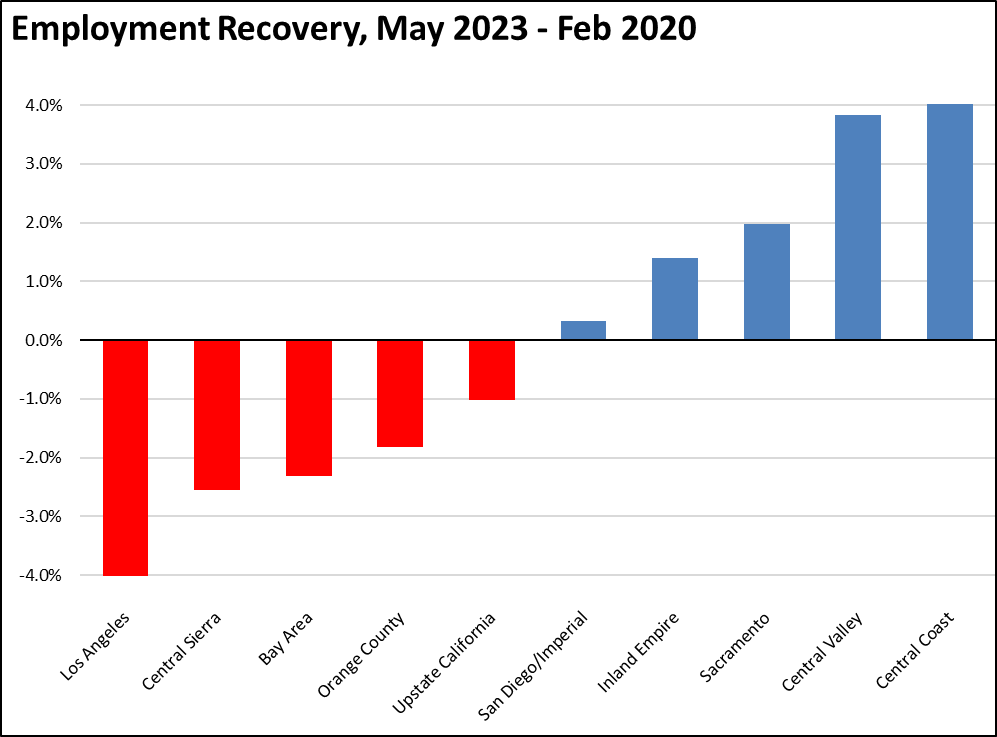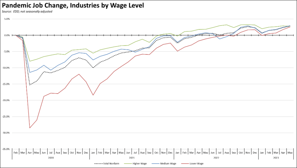 The change in nonfarm jobs (seasonally adjusted) from April and net growth since pre-pandemic February 2020 are shown below. The interior regions show the largest net job gains since the pre-pandemic peak, while the Bay Area and Los Angeles Regions show comparable net change. These two regions, however, led in the May 2023 jobs growth even with the continued factors affecting the tech industry in the Bay Area.